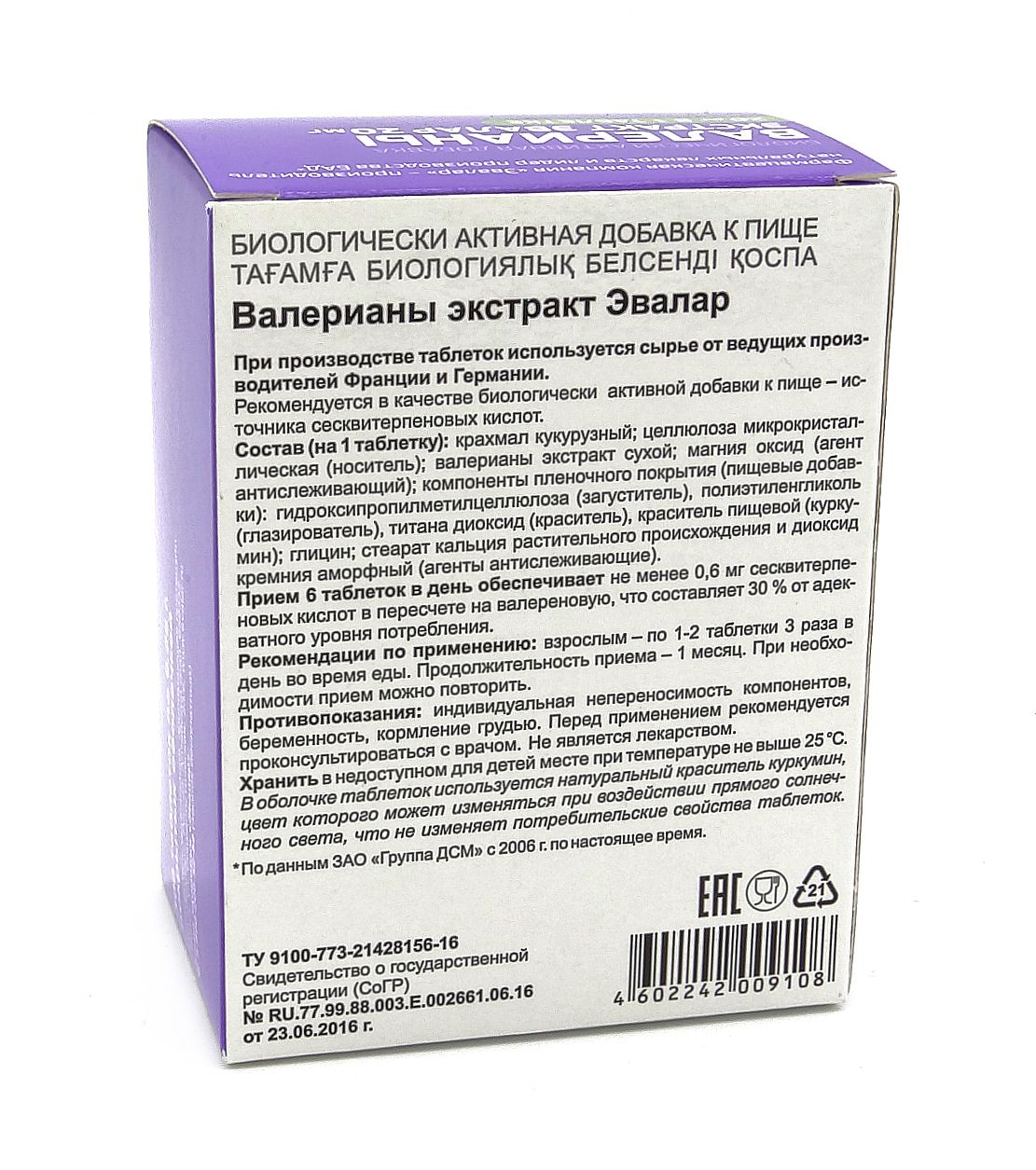 Прием 6 таблеток в день обеспечивает не менее 0,6 мг сесквитерпеновых кислот в перерасчете на валереновую, что составляет 30% от адекватного уровня потребления.